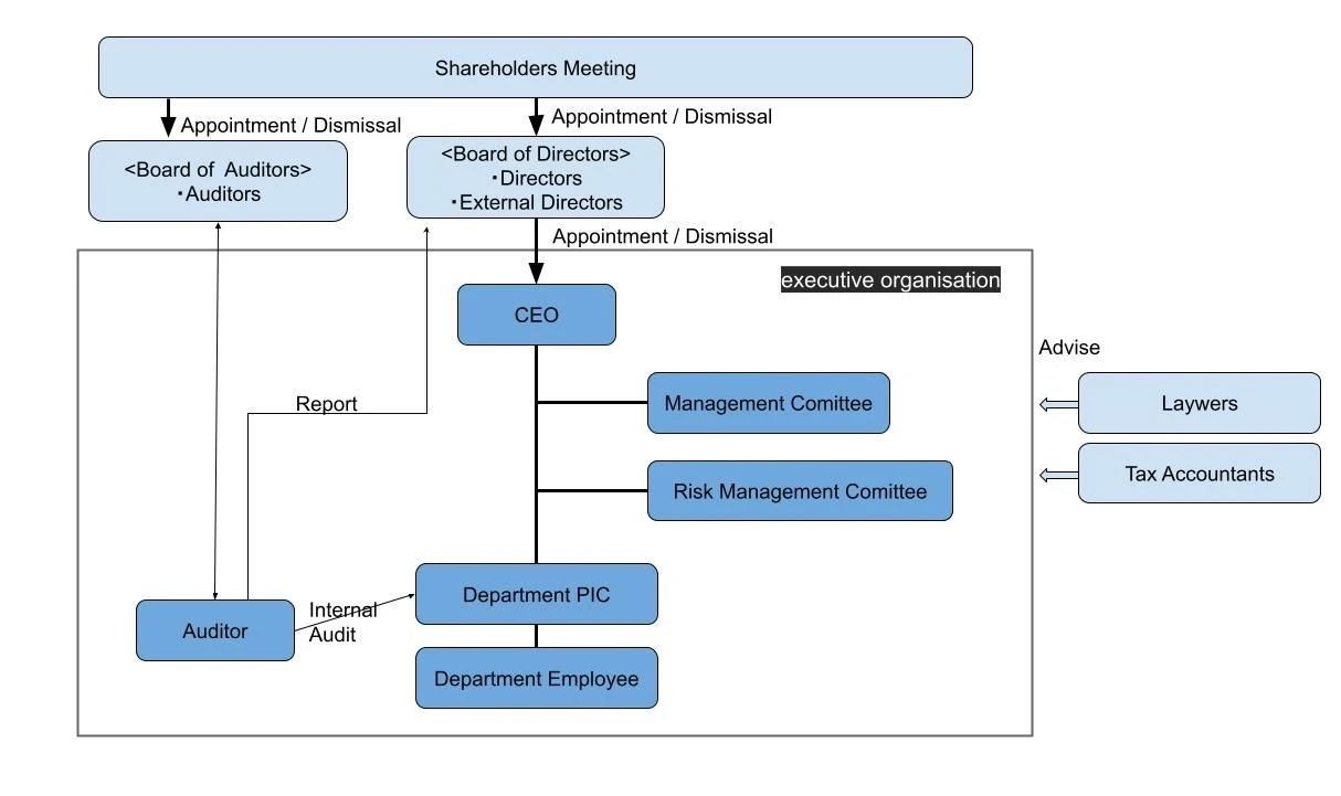 当社は、「監査役会設置会社制度」を採用しています。これは、会社業務に精通した取締役を中心とする取締役会が、基本方針や重要経営事項を自ら決定し、また、強い法的権限を持つ監査役が独立した立場から取締役の業務執行を監査することにより、経営の効率性および健全性を確保するうえで有効な体制であると判断しているためです。